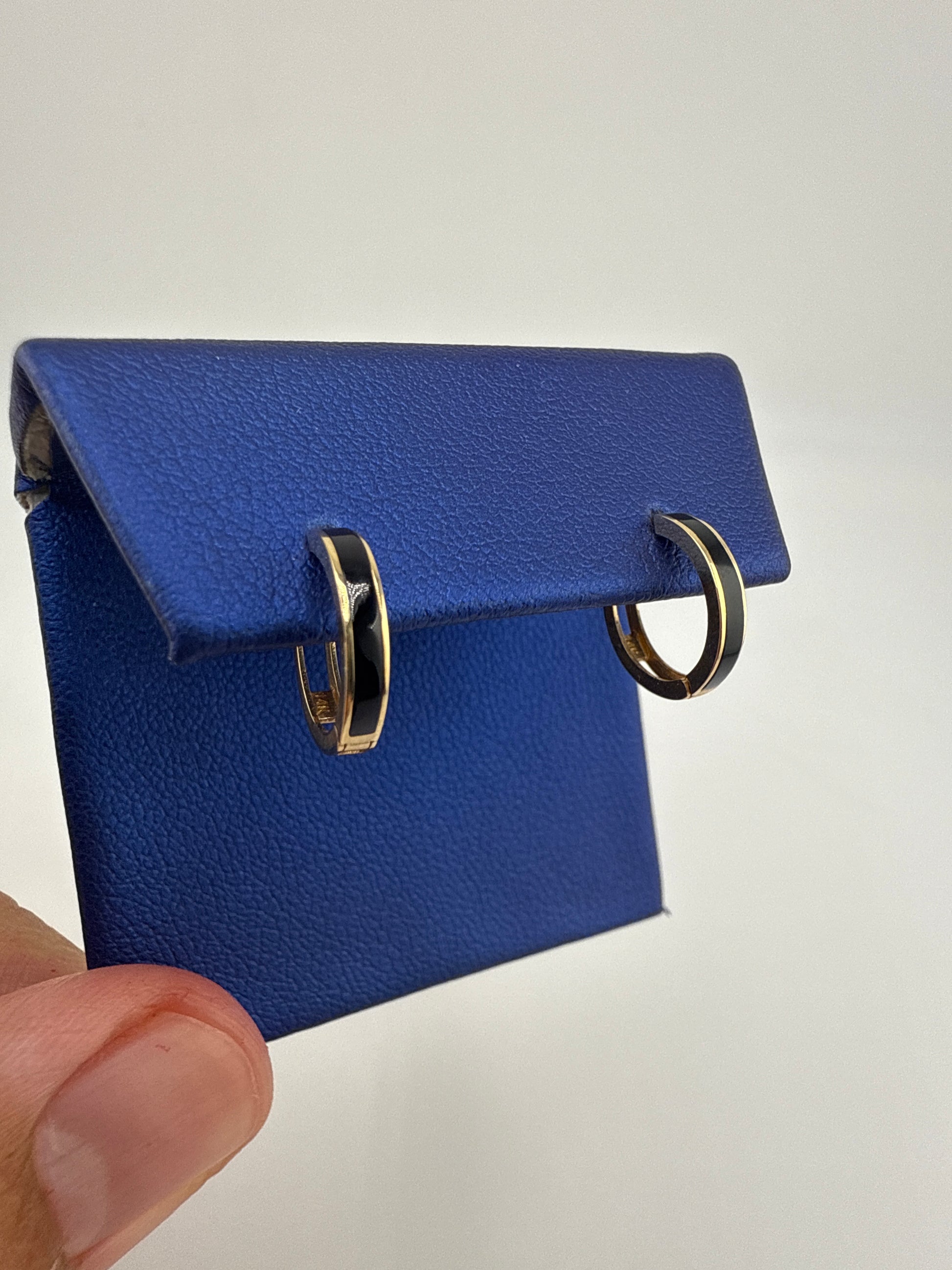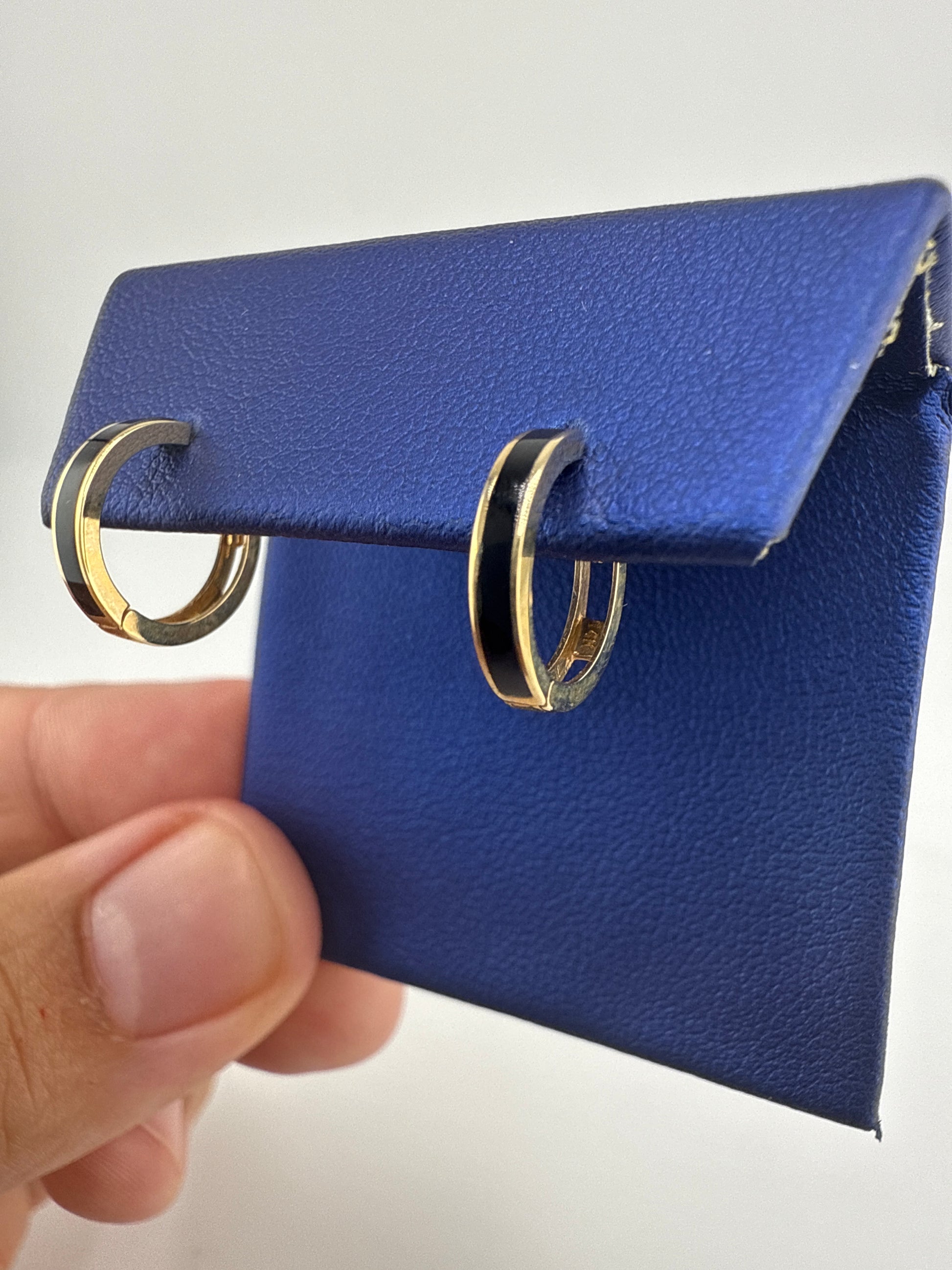 Elevate your style with these sleek 14k gold huggie earrings in a chic black hue. With a thin design and open backing, these earrings add a touch of modern sophistication to any outfit. A must-have for any jewelry collection.