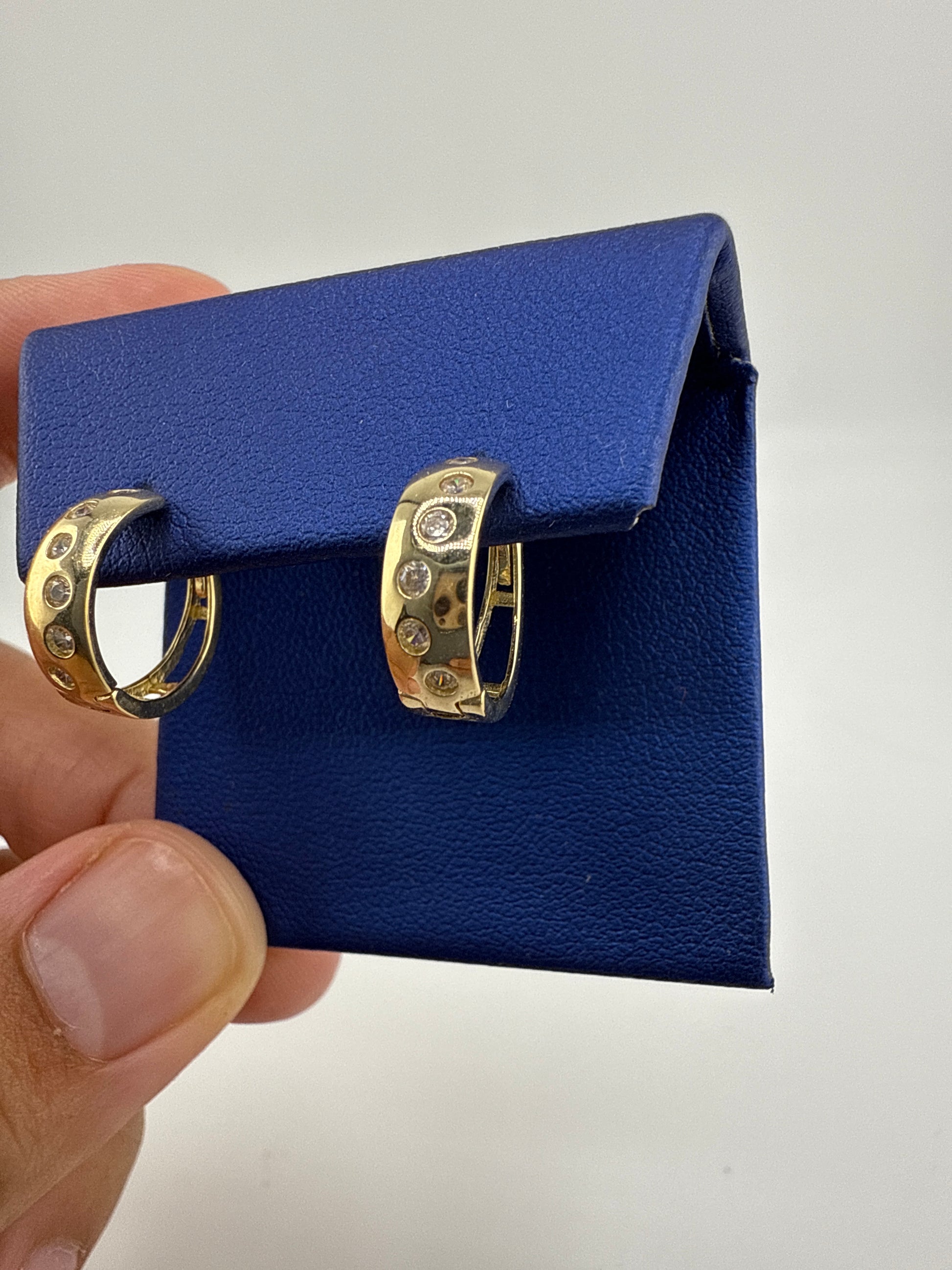 Add a touch of elegance to your look with our 14k gold huggie earrings featuring sparkling zirconia stones. The open backing allows for easy and comfortable wear, perfect for everyday use or special occasions. Elevate your style with these luxurious and chic earrings!