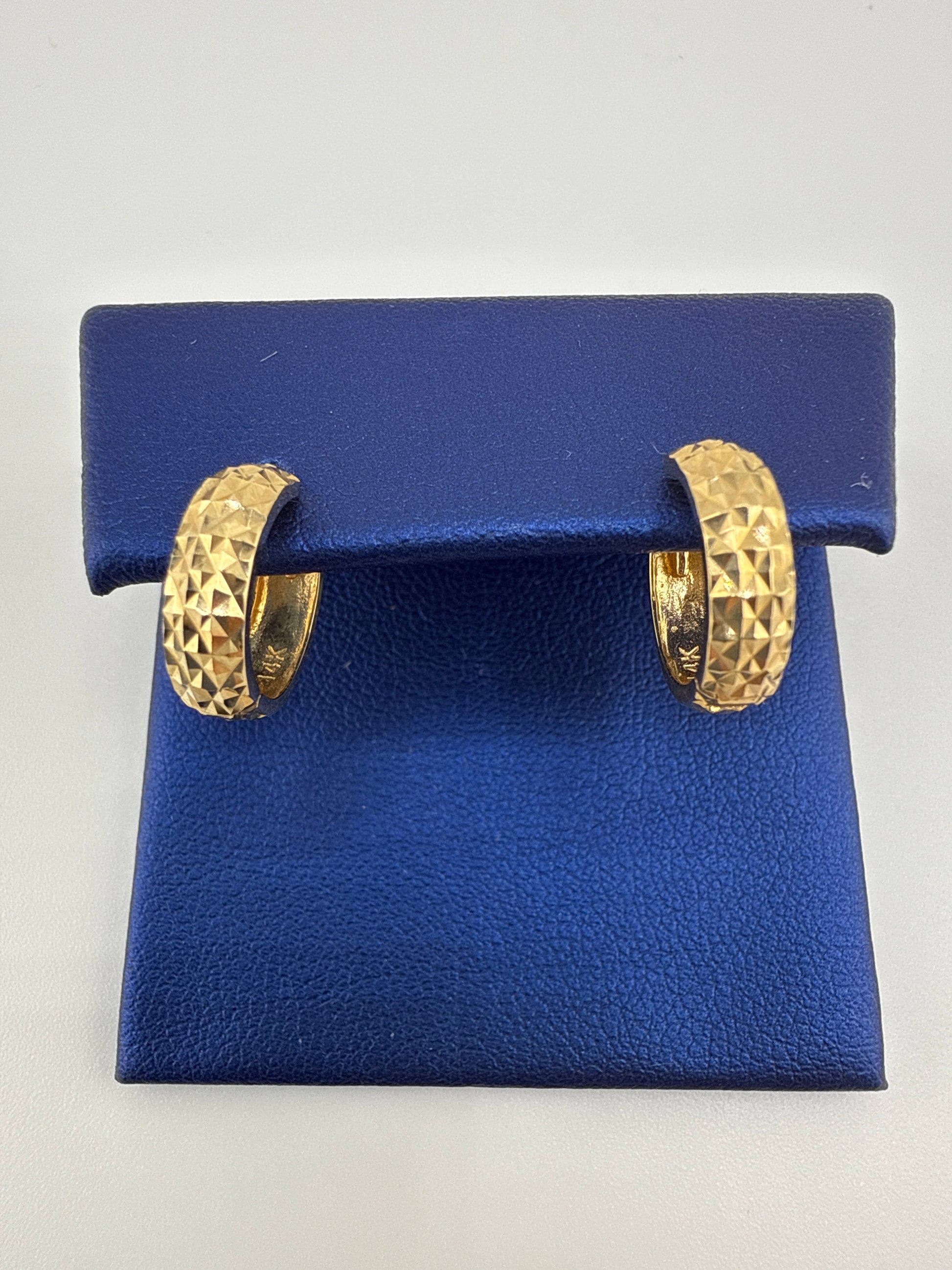 Indulge in the luxurious elegance of our 14k gold huggie earrings. The intricate hammered pattern design adds a touch of texture and depth to these stunning earrings. Elevate any outfit with these versatile and timeless accessories. Treat yourself to a touch of opulence today!