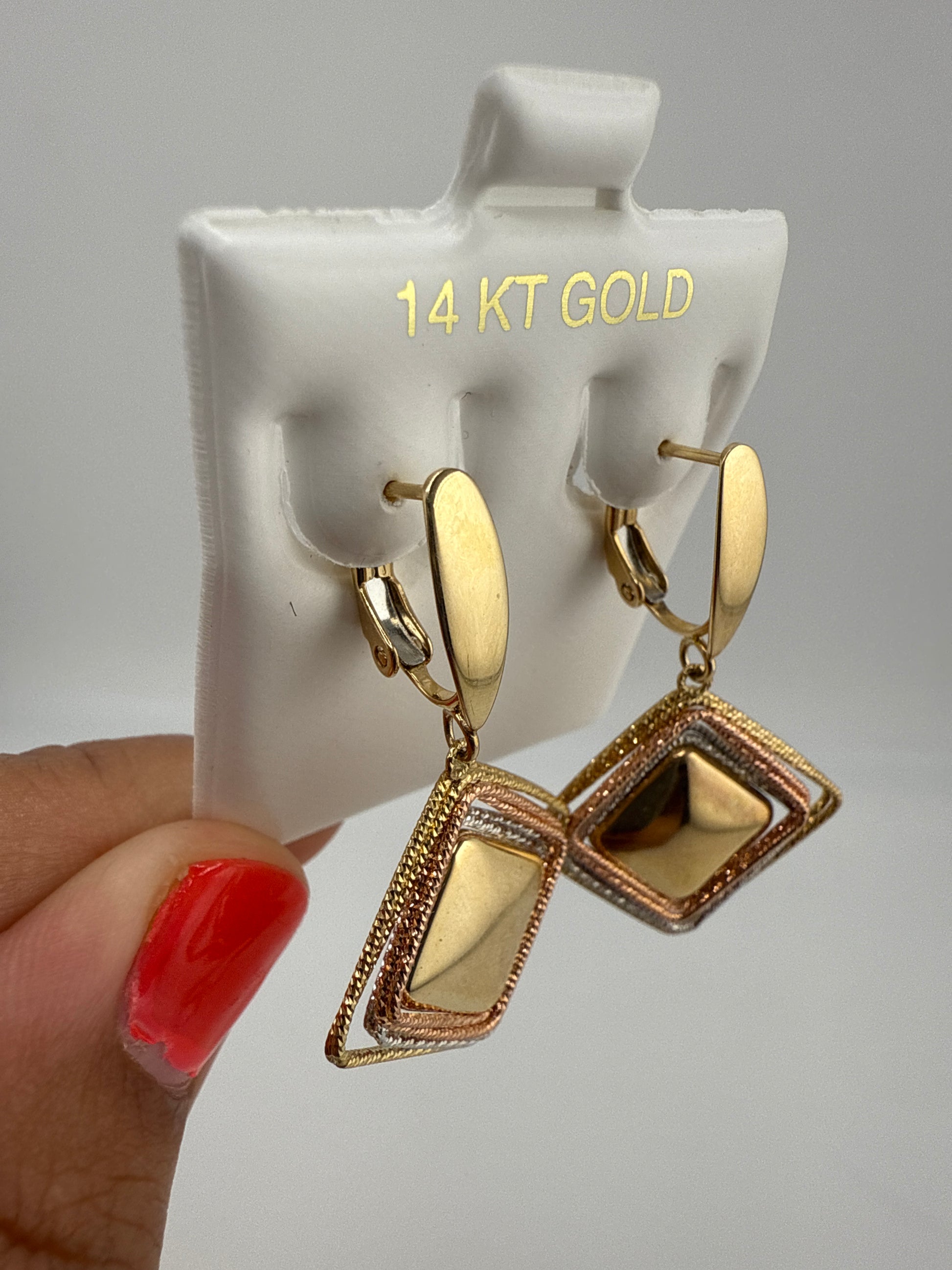 Get ready to fall in love at first sight with these 14k Tri-Color Huggie Earrings! Their square detail adds a touch of elegance and playfulness to whatever outfit you pair them with. Don't miss out on these unique and stylish earrings!