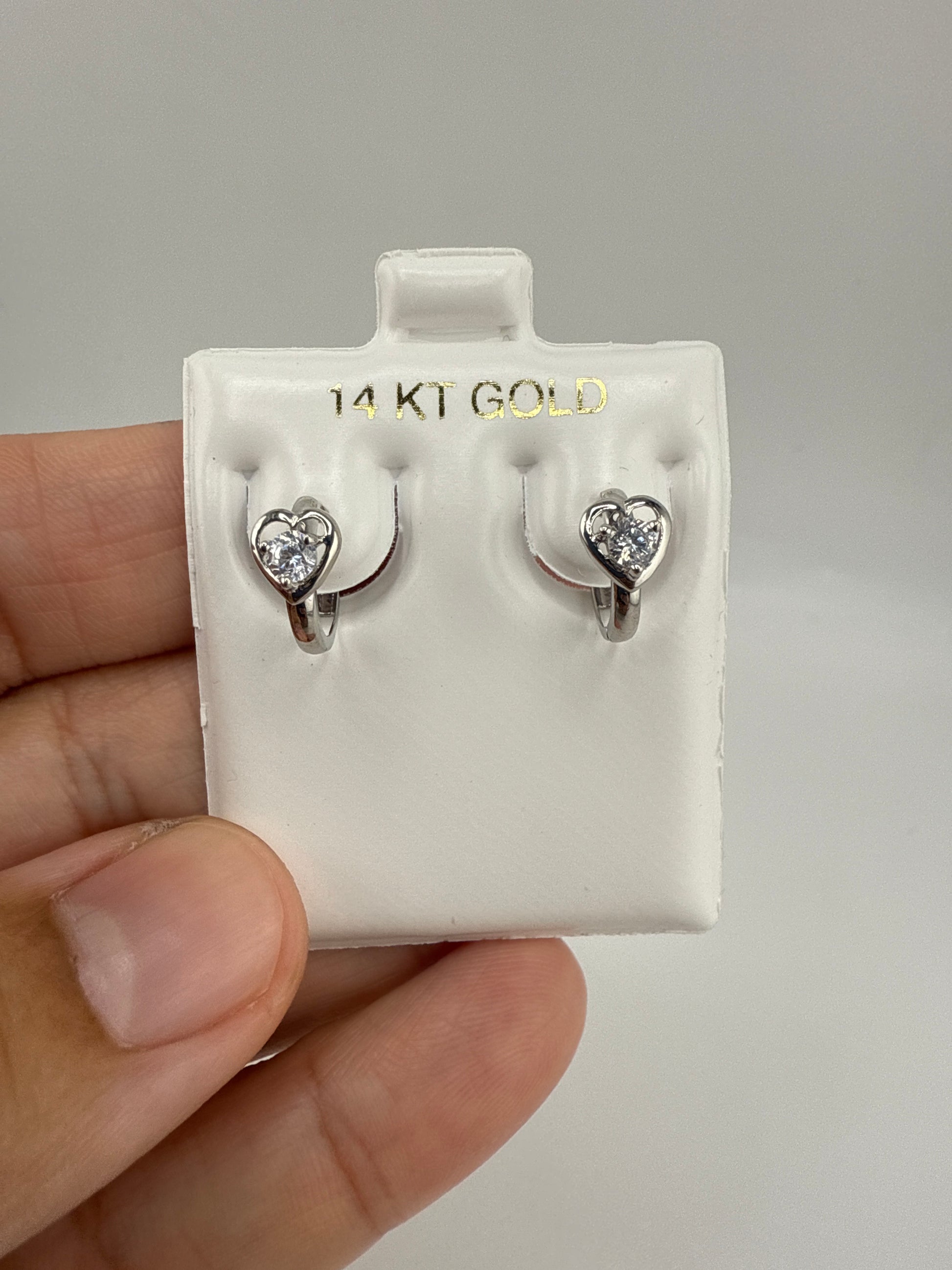 14k White Gold Small Huggie Earrings with Zirconia and Heart detail