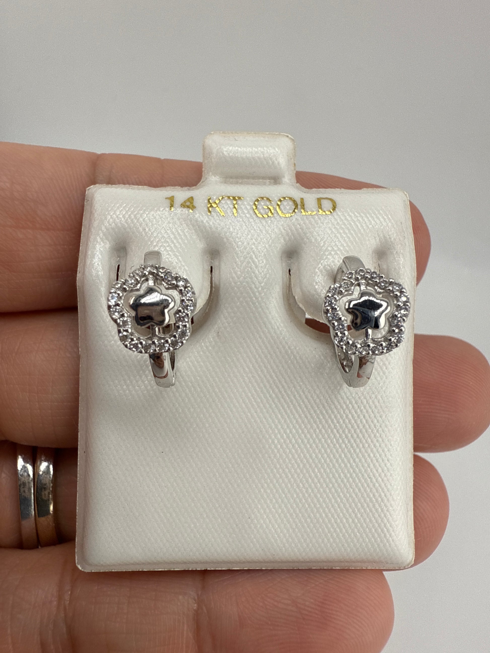 14k White Gold small Zirconia Huggie Earrings with Flower and Star details