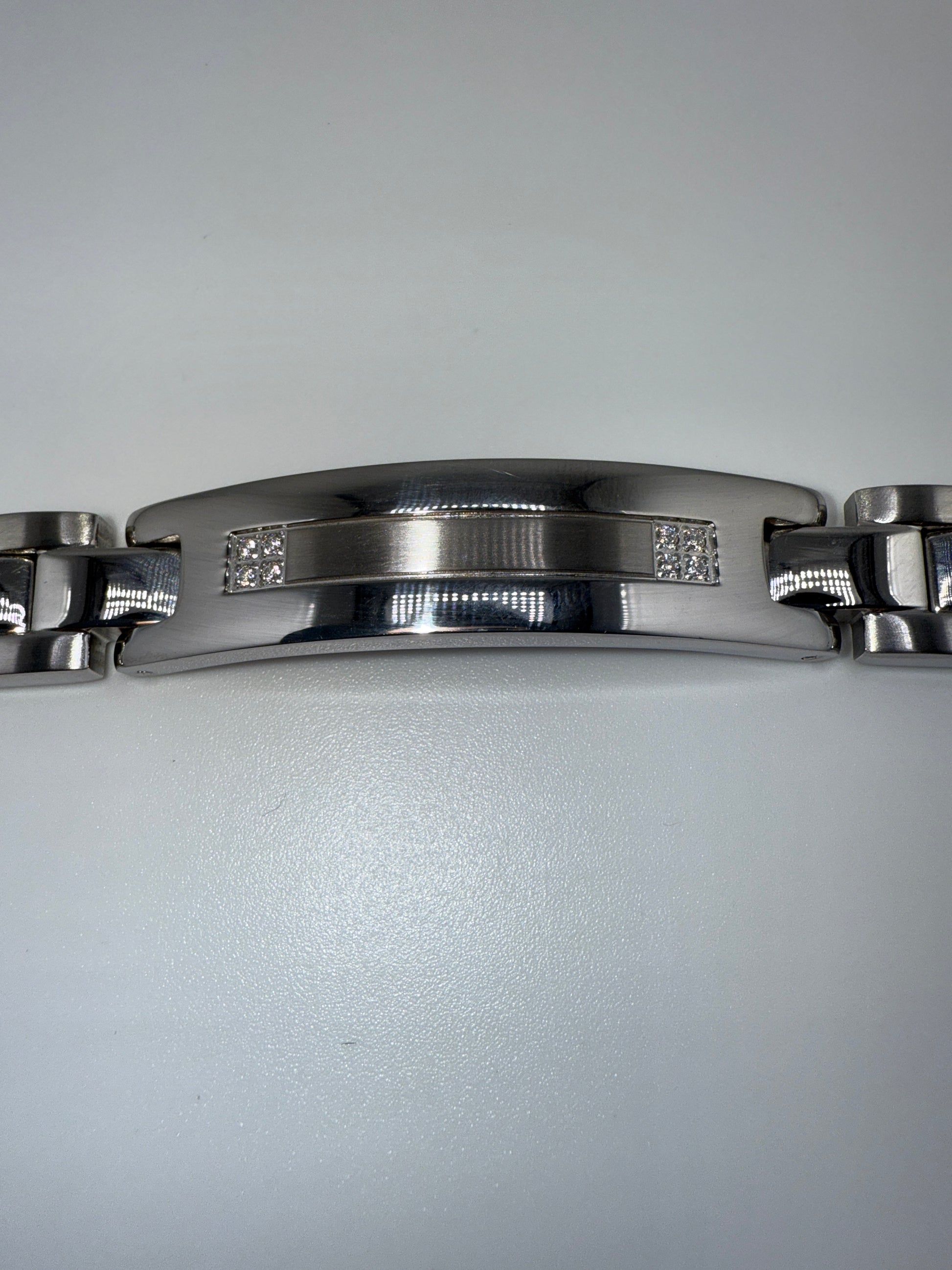 Discover the beauty and elegance of our Stainless Steel Zirconia ID Link Bracelet. Crafted from high-quality stainless steel and adorned with stunning zirconia stones, this bracelet is the perfect accessory for any occasion. Its delicate design and durable materials make it a timeless addition to any jewelry collection. Elevate your style today with this exquisite bracelet!