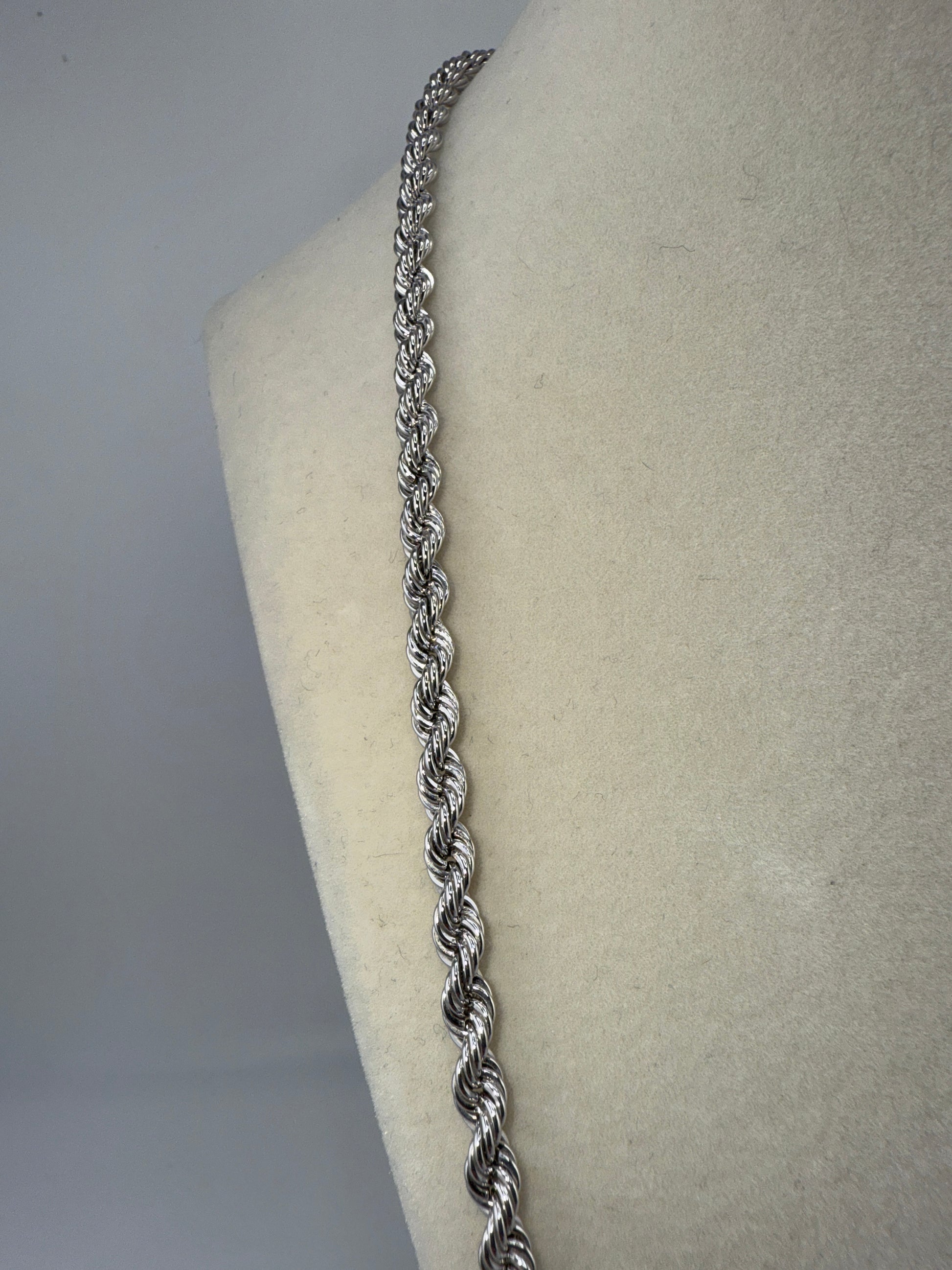 Transform your outfit with our stunning sterling silver 24inch 4.5mm loose rope chain, expertly rhodium plated for high shine and durability. Elevate your style and make a statement with this versatile and elegant accessory. Perfect for any occasion, this chain is a must-have for any jewelry collection.