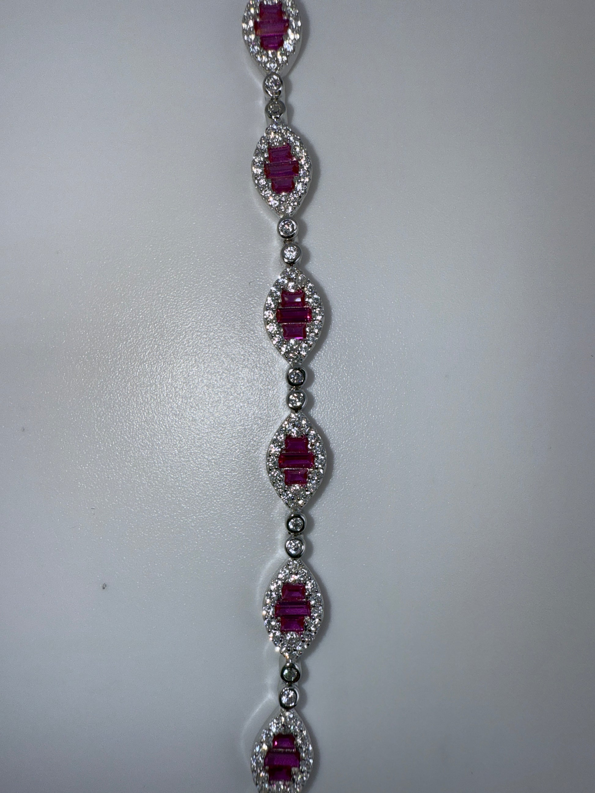 Add a touch of elegance to any outfit with our Sterling Silver Baguette Tennis Bracelet. Sparkling zirconia rubies set in a delicate sterling silver chain provide a timeless and sophisticated look. Perfect for any occasion, this bracelet will make you feel confident and glamorous.