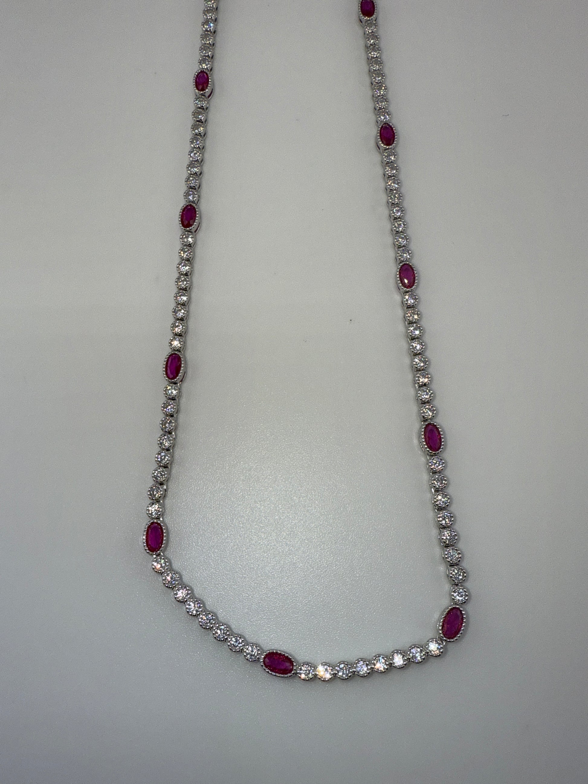 Sterling Silver Beaded Outline Oval & Round Zirconia Tennis Necklace - Ruby