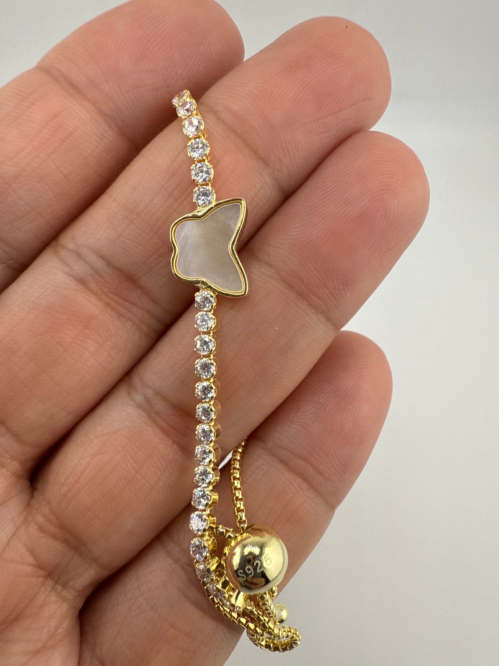 Add a touch of elegance to your everyday style with our Sterling Silver, Butterfly MOP Center, Zirconia Bolo Bracelet. The beautiful butterfly design and adjustable fit make it a must-have accessory for any occasion. Made with high-quality materials and gold-plated for a luxurious finish. Elevate your look with this stunning bracelet!