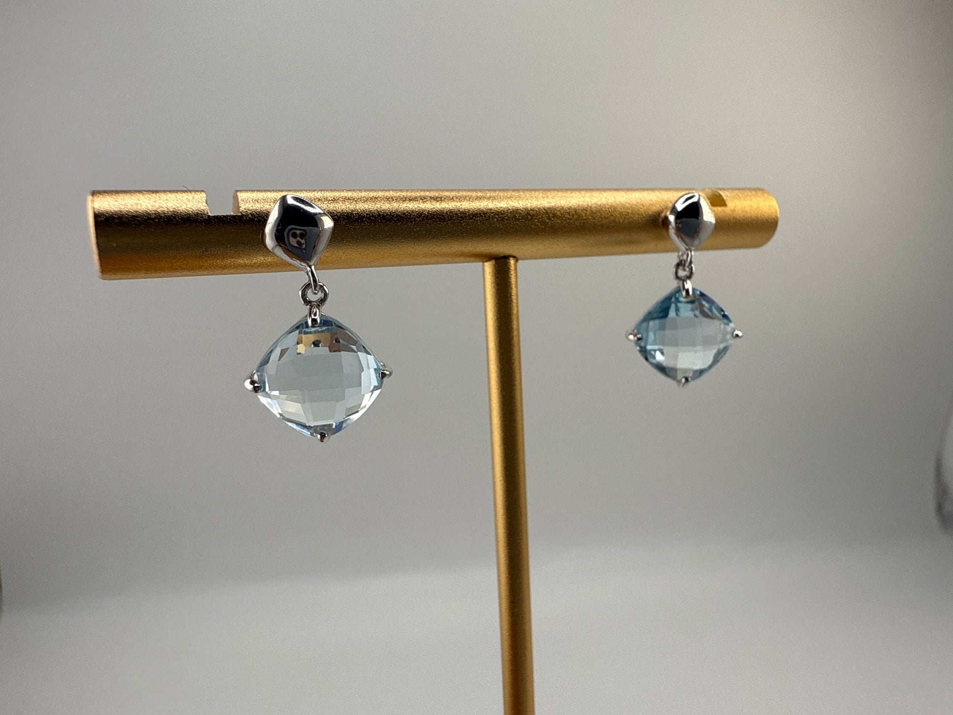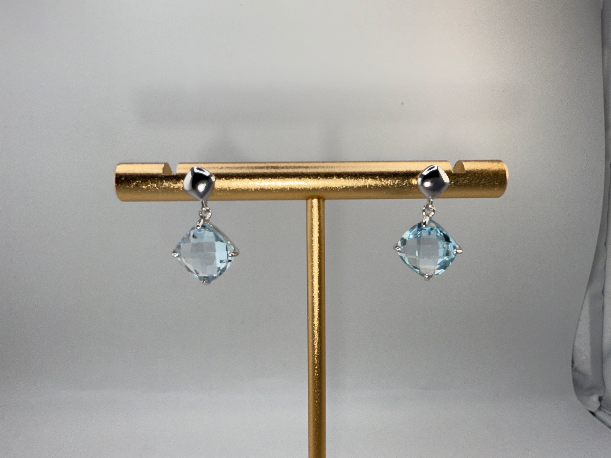 Indulge in the luxurious elegance of these Sterling Silver Four-Prong Square Cushion-cut Gem Earrings featuring stunning Blue Topaz stones. Crafted with high-quality materials, these earrings boast a timeless design that will add a touch of sophistication to any outfit. Elevate your style and make a statement with these breathtaking earrings!