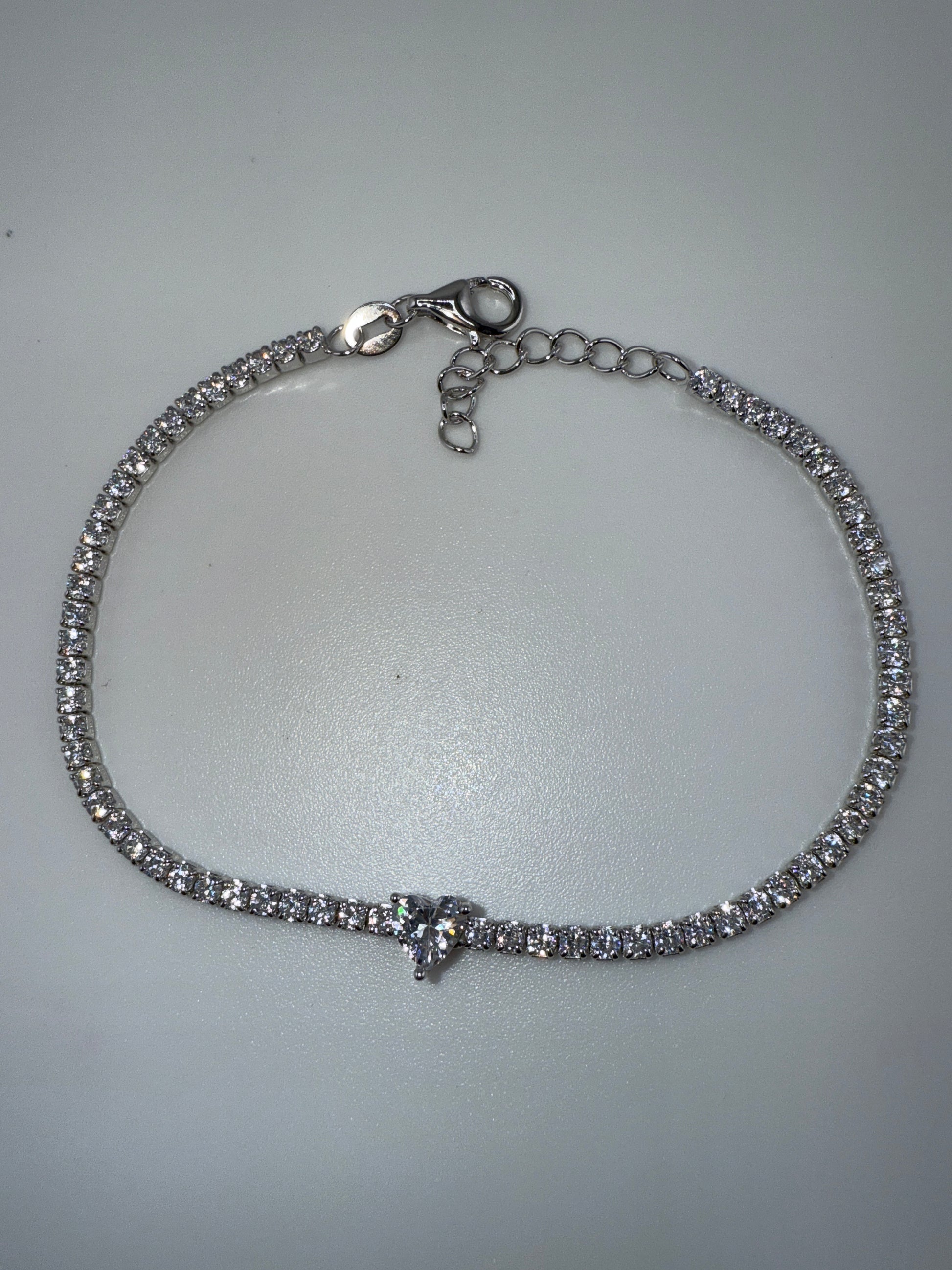 Experience elegance and love with our Sterling Silver Heart Tennis Bracelet. Made from high-quality sterling silver, this bracelet features charming heart-shaped links that delicately wrap around your wrist. Elevate any outfit and show off your passion for style and love with this timeless accessory.