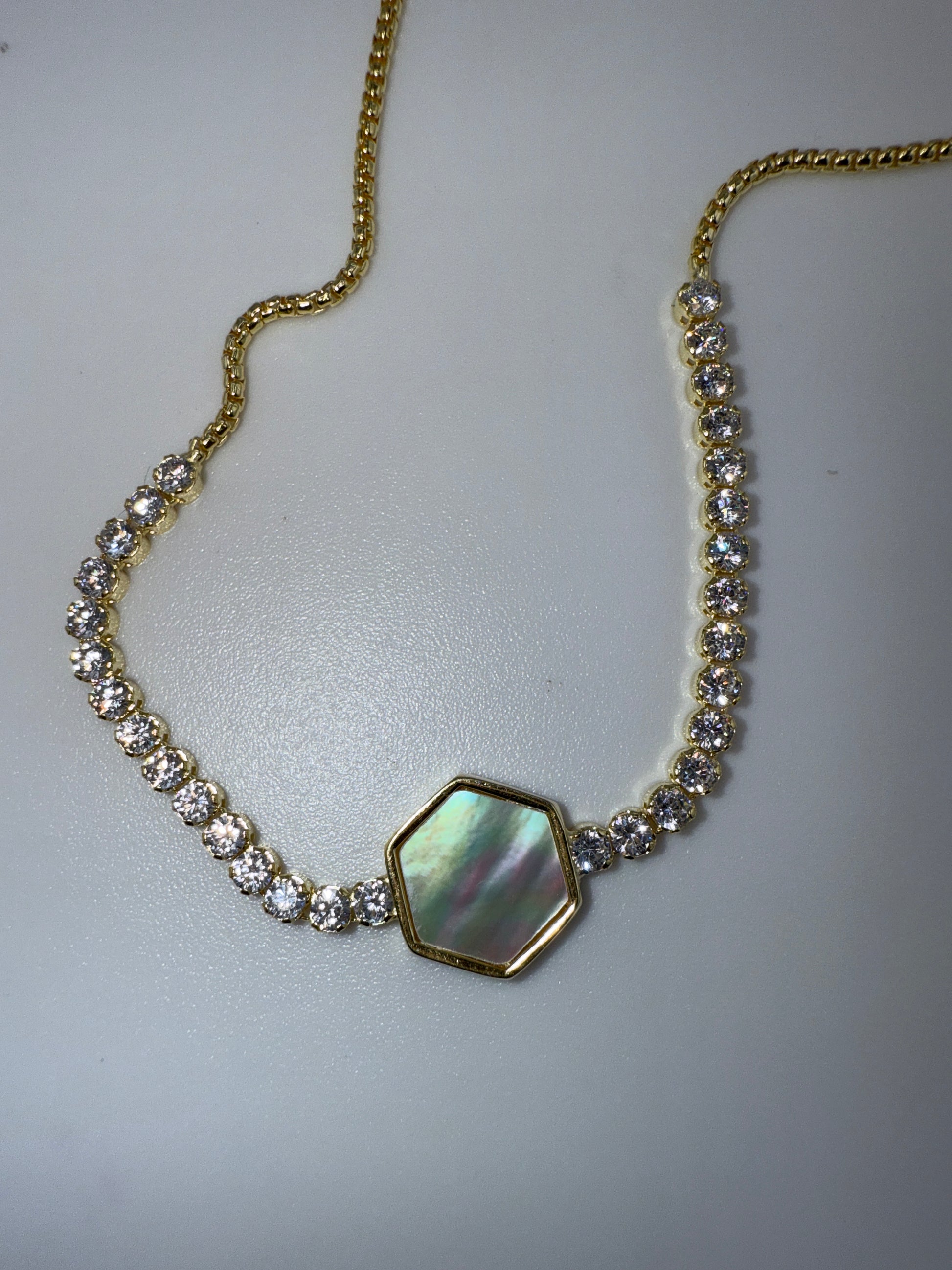 Elevate your jewelry game with our stunning Sterling Silver Bolo Bracelet! The hexagon MOP center adds a touch of elegance while the adjustable bolo design ensures a perfect fit. Complete with sparkling zirconia stones and a gold-plated finish, this bracelet is both chic and versatile.