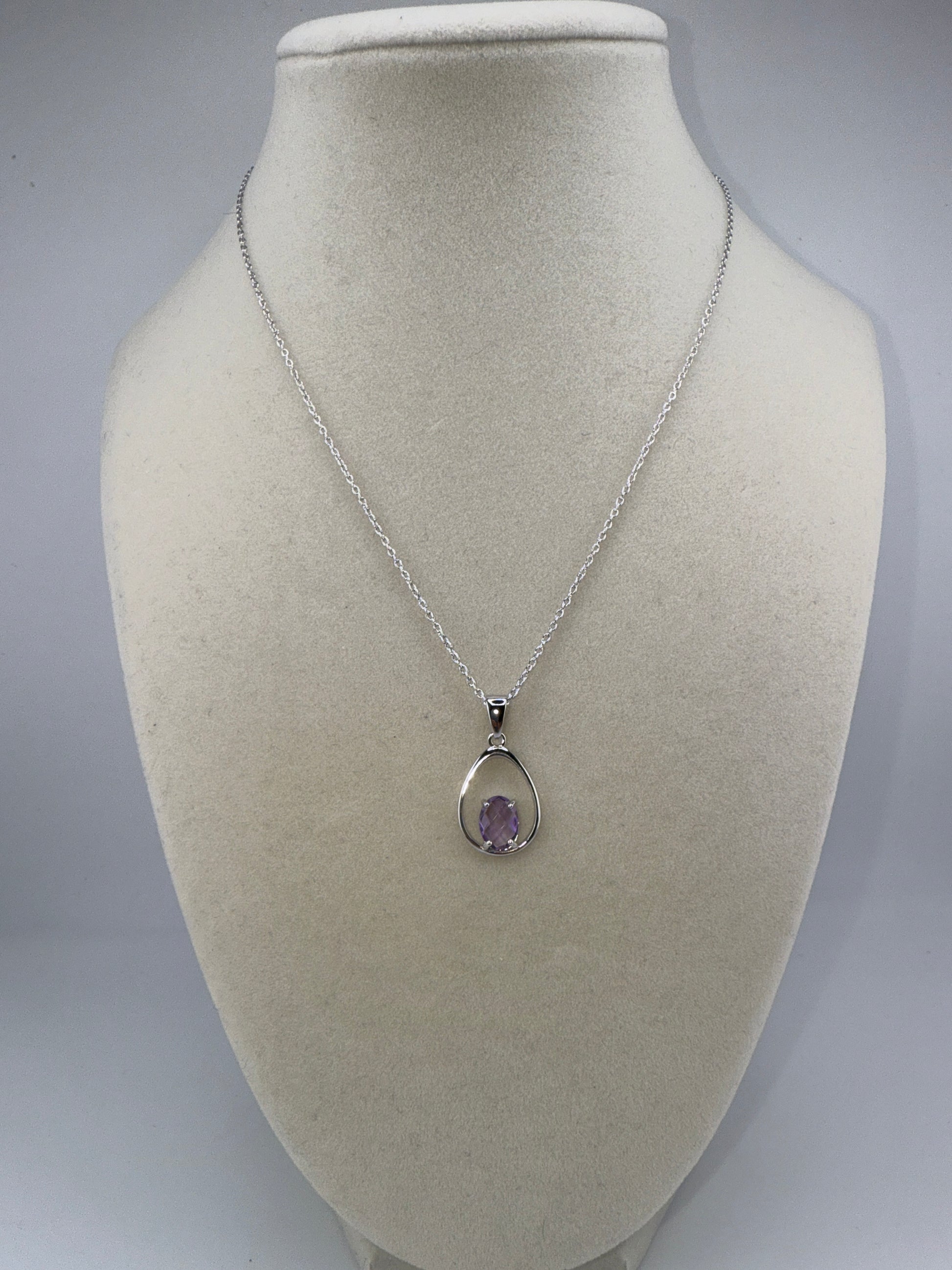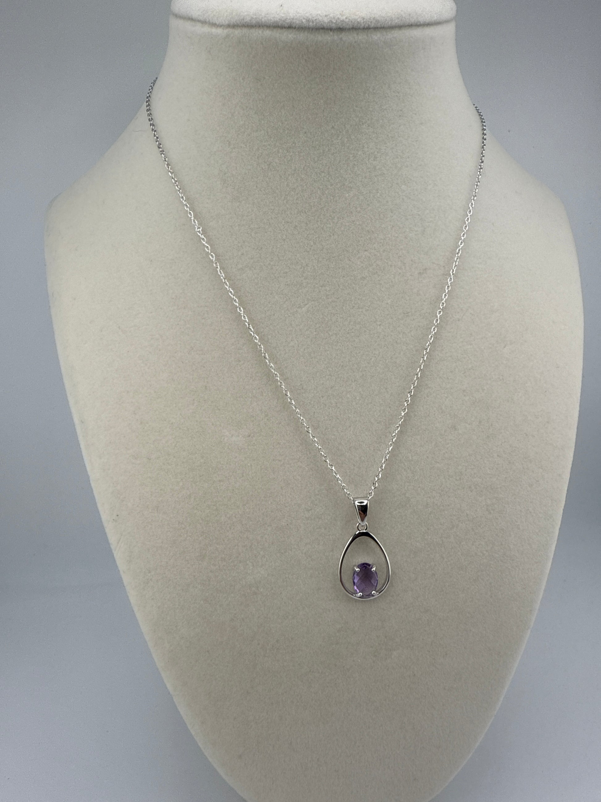 Elevate your look with our dazzling Sterling Silver Pear-Shaped, Four-Prong Gem Necklace featuring a vibrant Amethyst stone. Perfect for adding a touch of elegance and sophistication to any outfit. Made with high-quality materials and expert craftsmanship, this necklace is a must-have for any jewelry collection.